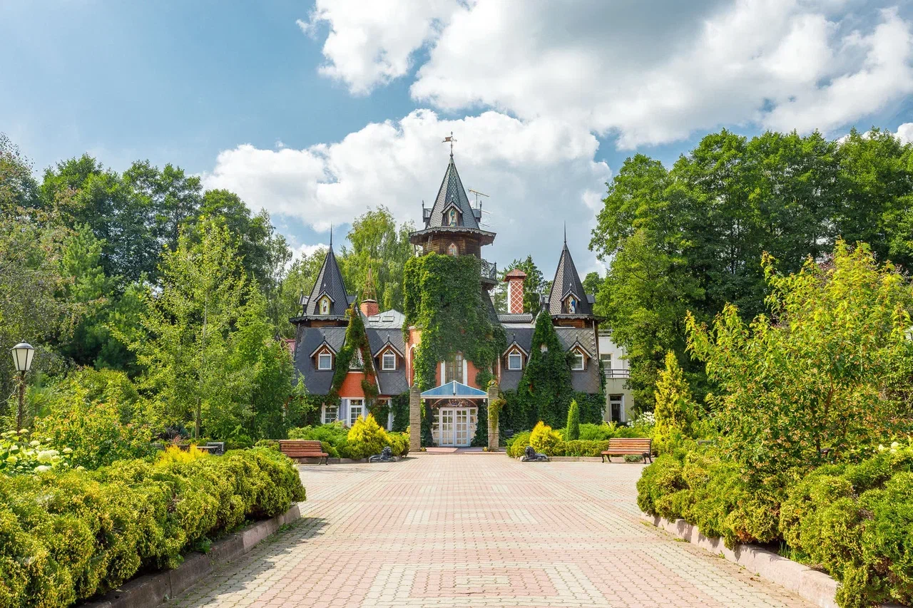 Отель располагается на большой территории посреди роскошного парка с античными скульптурами, который украшает сад камней, редкие цветы и декоративные кустарники. На западной границе парка протекает река Хрипань, вдоль которой высажена аллея черной ольхи и проложена прогулочная дорожка. На территории обитают дикие утки, чайки, белки, лисы, зайцы, ежи и домашние животные.